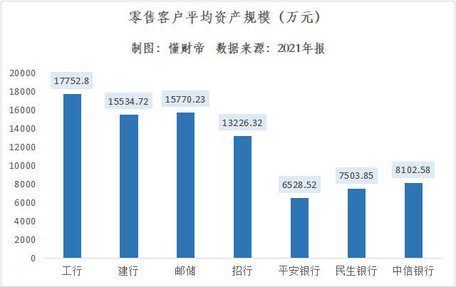 根据财报披露的数据计算,2021年,国有大行零售客户平均资产规模均高于股份制银行。