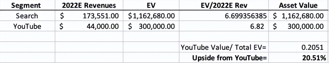 尽管逆风而行,我仍然认为YouTube是一项高价值的运营资产,在独立的基础上为投资者带来了好处。假设2022财年YouTube收入同比增长20%,达到440亿美元,我的估值模型使用6.8倍EV/2022E rev倍数对YouTube的估值为2992亿美元。这意味着,如果单独在纽交所交易,YouTube有20.51%的上涨空间(见下文)。