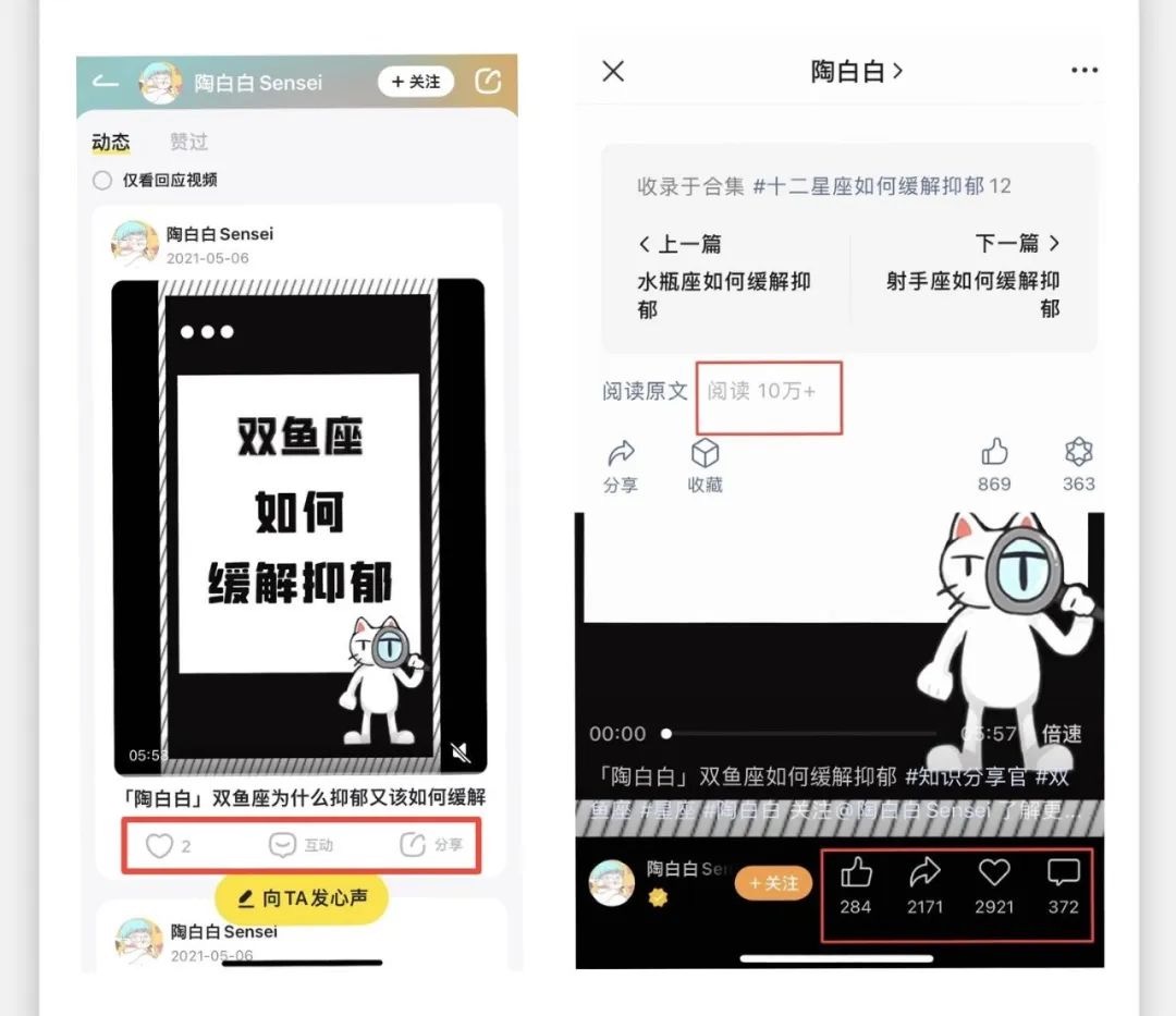 以头部星座博主“陶白白Sensei”发布的《双鱼座为什么抑郁又该如何缓解》为例,该视频发布在彼应上后,仅获得了2个点赞,0个互动。而同一条视频在5个月后发布在微信公众号后,获得了10万+阅读,在视频号上也获得了超2000次转发和点赞。