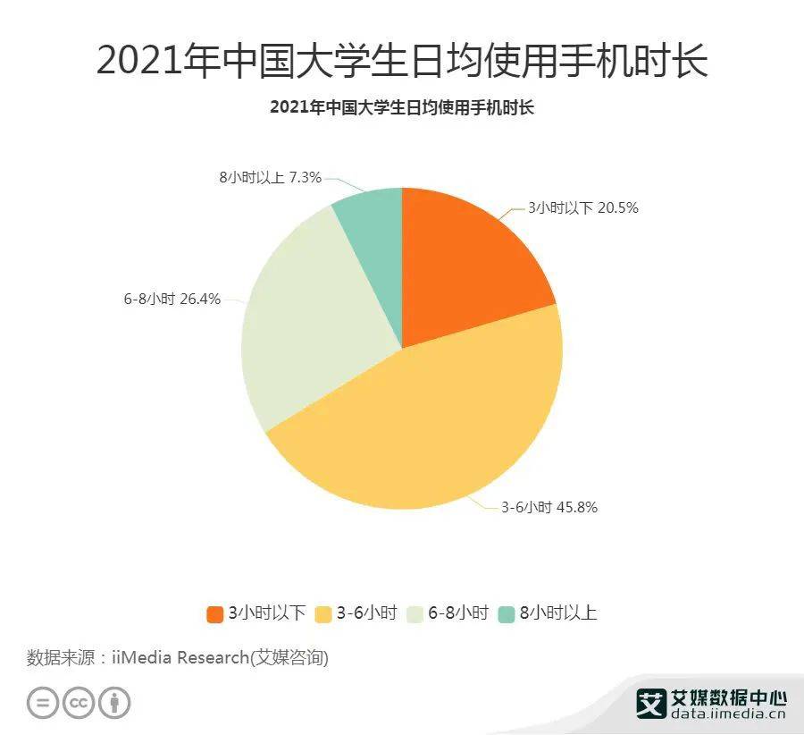 艾媒咨询数据显示,2021中国大学生群体中有45.8%的人日均使用手机时长为3~6小时,26.4%的人日均使用手机时长为6~8小时,日均使用手机时长在8小时以上的人数占比也达到了7.3%。