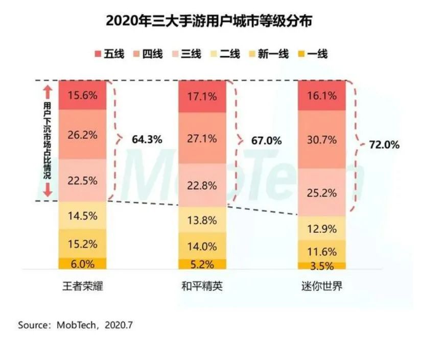 《王者荣耀》本身与环球影城也存在着一定的受众错位。据Mob研究院《2020“下沉市场”图鉴》显示,《王者荣耀》在二线及二线以下城市的用户占比为78.8%,是下沉市场最受欢迎的手游TOP3。