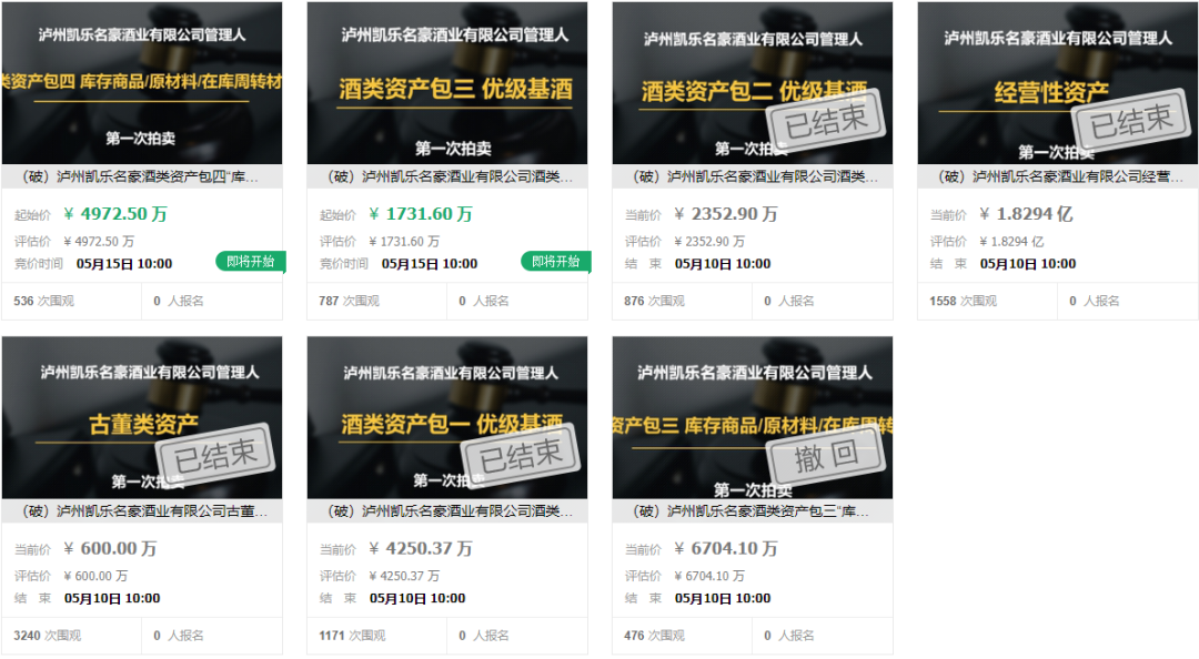 5月9日至10日,在阿里资产处置平台上,泸州酒企凯乐名豪酒业有限公司(以下简称凯乐名豪)对其旗下四项经营性资产进行第一次公开拍卖,起拍价合计约2.55亿元,最终因无人缴纳保证金入场竞拍而流标。