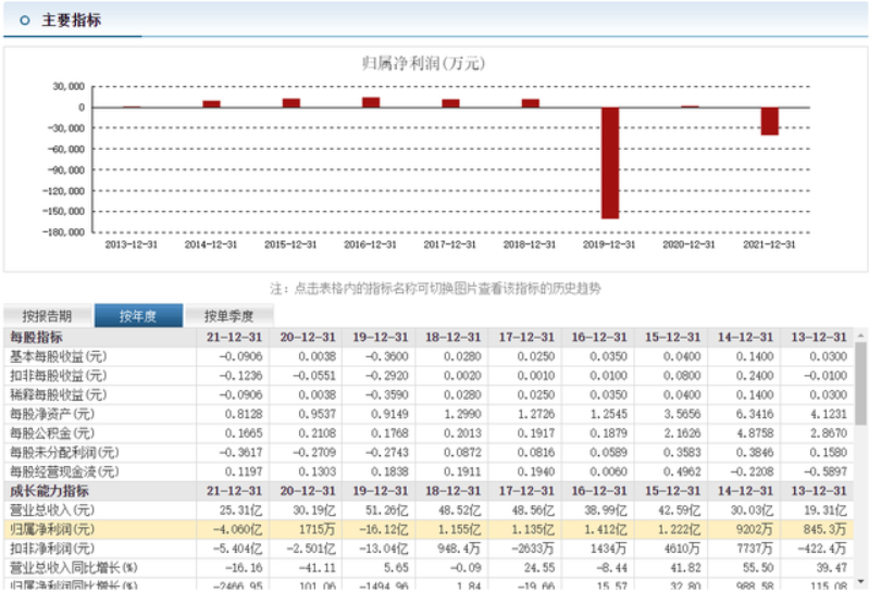 2019年-2021年,爱康科技实现的营业收入分别为51.26亿元、30.19亿元、25.31亿元,已经连续三年下降;实现的扣非净利润分别为-13.04亿元、-2.5亿元、-5.40亿元,同样连续三年为负。
