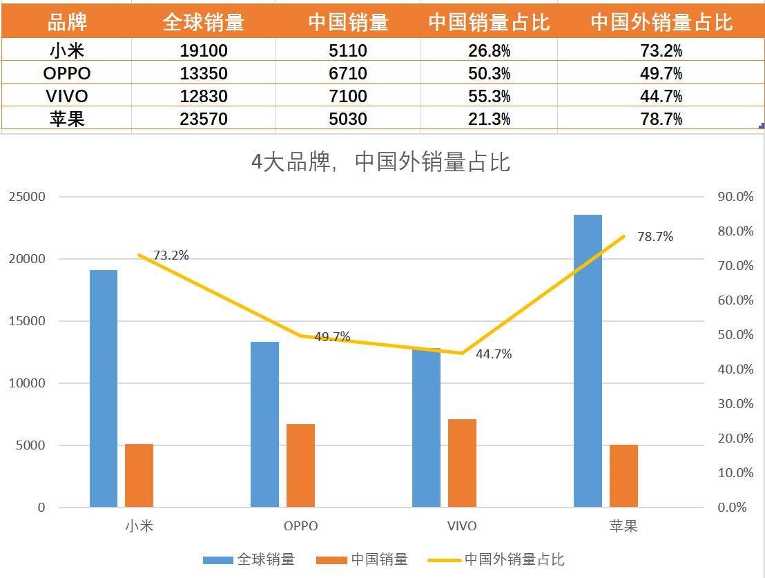 VIVO开年的走势就如此低迷,原因之一是Q1季度本就不是VIVO的主战场,四月才是VIVO的产品发布月,因此Q1季度的销量走低也是有迹可循。此外,从根本上分析VIVO,整体局势也不容乐观。首先,VIVO过于依赖国内市场,从数据可以看出来,VIVO国内的销量占比为55.3%,而小米占比仅26.8%。