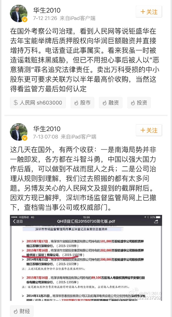 但人民网于7月12日曝出一则市场人士的消息称,“宝能系”在2015年7月开始举牌万科时,宝能集团曾将持有旗下钜盛华的20.2亿股份质押给华润集团下属的华润(深圳)有限公司获取资金。此后,华润发表声明称,“此事与万科股权之争毫不相关,有人借此炒作,混淆视听的做法是极不负责任的。”