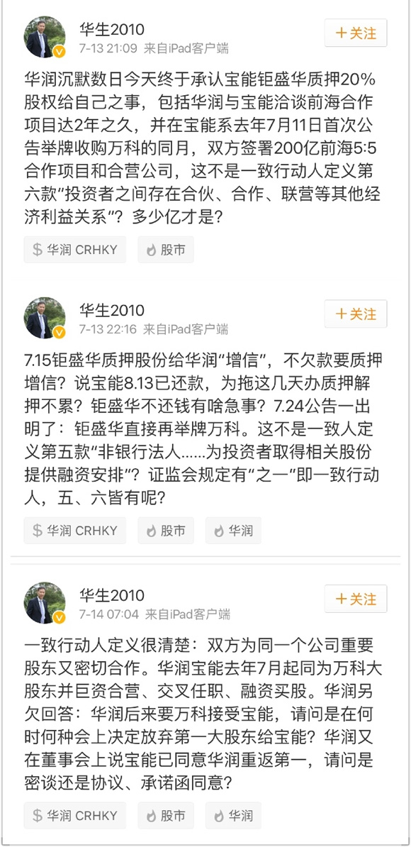 7月14日早间,万科A(000002.SZ)独立董事华生在其个人微博中发声:“一致行动人定义很清楚:双方为同一个公司重要股东又密切合作。”这是7月12日以来,华生在其个人微博上发布的第五篇关于“一致行动人”的微博。