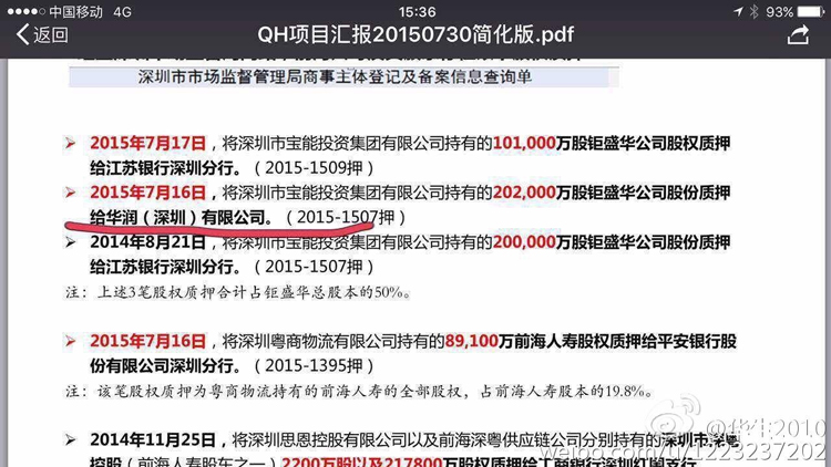 网络公开信息显示,2013年,华润置地开始和宝能地产商谈合作开发前海项目,并在2015年7月签署合作协议。由于宝能的合作款有既定支付节点,华润置地要求用钜盛华20%的股权质押作为增信条件,宝能于2015年8月13日支付合作款以后,质押才解除。