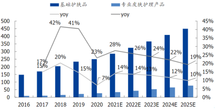 2016-2025E中国皮肤护理市场各品类规模及增速(十亿元,%)