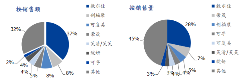 据弗若斯特沙利文数据,2019年敷尔佳在医用皮肤修护敷料中市占率达37%(按销售额),创尔生物的创福康占32%,而巨子生物的可复美仅占8%。2020年贴片类专业皮肤护理产品市场中,销售额排名第一的是敷尔佳占21.3%;其中医疗器械类敷料产品占25.9%,同样排名第一。