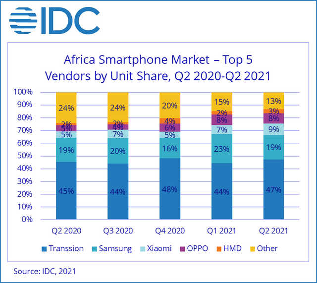 非洲头部手机厂商市场份额,图源:IDC