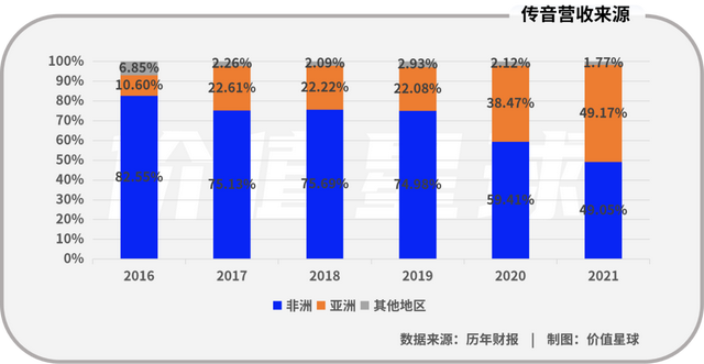 尽管纵观2021年业绩,传音的表现依然稳健。公司实现营业收入494.12亿元,同比增长30.75%;归属于上市公司股东的净利润39.09亿元,同比增长45.52%。但仔细观察收入结构就可以发现,增量几乎全部来自于非洲以外的市场。从公司营收的地区分布来看,亚洲业务营收甚至已经超过了非洲。