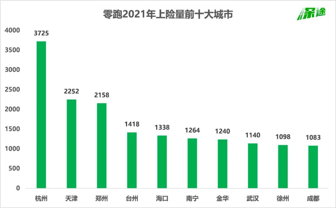 深途获得的一份零跑交强险数据显示,2021年零跑销量排名前十的城市是杭州、天津、郑州、台州、海口、南宁、金华、武汉、徐州、成都,以二三线城市为主。
