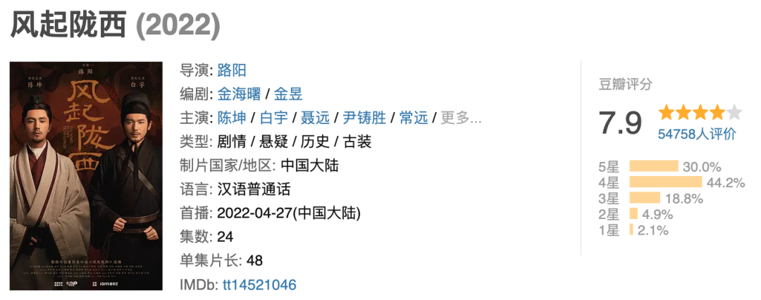 即便如此,在多数普通观众不能理解的情况之下,《风起陇西》口碑却后劲十足,从豆瓣开分7.7上升至7.9,尚有破8势能,处于马伯庸影视作品第二高口碑,而这背后离不开坚持到底的“忠实观众”、原著粉丝、历史爱好者们的推崇。