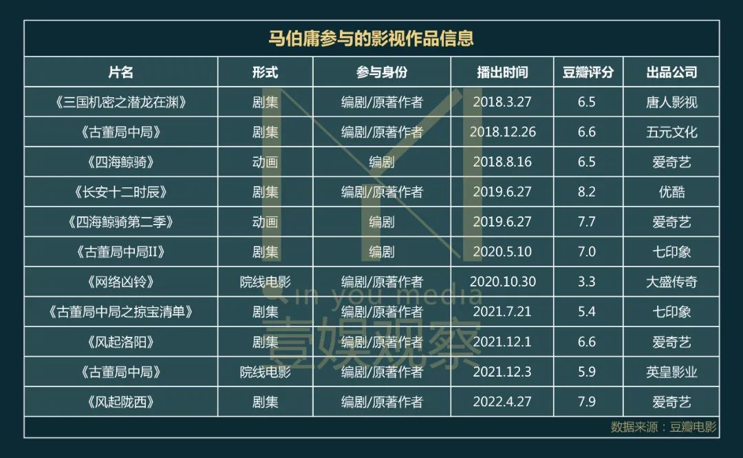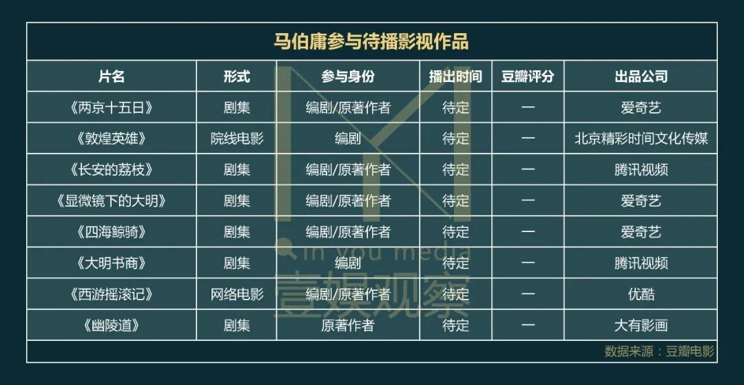 壹娱观察(ID:yiyuguancha)整理了马伯庸相关的影视作品信息,据不完全统计,马伯庸已经有11部作品播出,其中内容样态涵盖剧集、动画、院线电影、网络电影,马伯庸自己也以编剧、原著作者、制片人等多种身份深度参与,携手国内多个优质制作团队。
