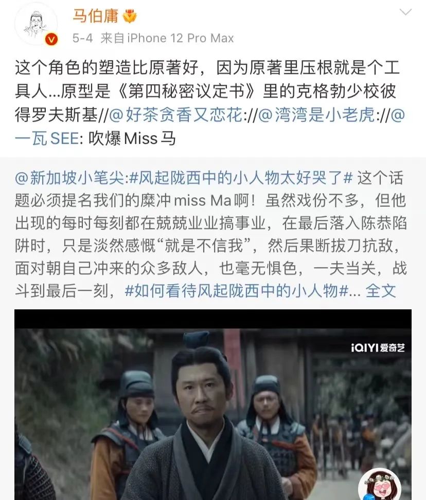 比如《风起陇西》,圈层观众看到了更丰富的历史人物,李严、杨仪、蒋琬这些即便在游戏也是“大众脸”的三国重要人物,终于得到关注。马伯庸曾发微博——好友感慨:“自有三国题材文艺作品以来,这应该是李严戏份最多、存在感最强的一次,李正方可以瞑目矣。”