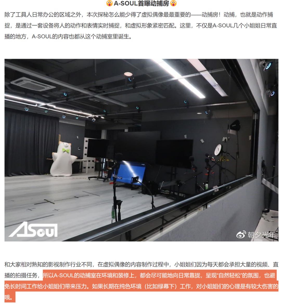 尤其是在讲到动捕室和练歌房的时候,朝夕光年着重提及他们给这些专业训练场所营造了一个“自然轻松”的氛围,避免中之人们在长期在纯色环境下工作,减少她们的心理压力。现在看来,自诩一贯低调的朝夕光年突然发布这样一篇文章,算是事出有因了。