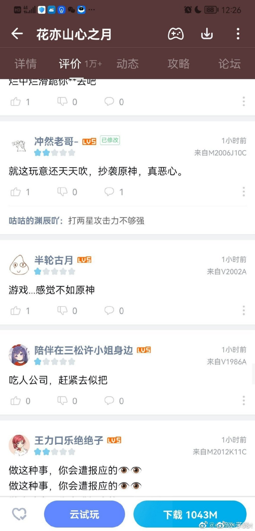 显然,5月11日官方的回应无法获得粉丝们的认可,粉丝们把自己的怒火也开始烧向了字节跳动的其他产品。第一个倒霉鬼就是朝夕光年自研的女性向游戏《花亦山心之月》,这款游戏曾经与A-SOUL进行过联动,现在他的B站评论区被愤怒的粉丝打上了一星评价。