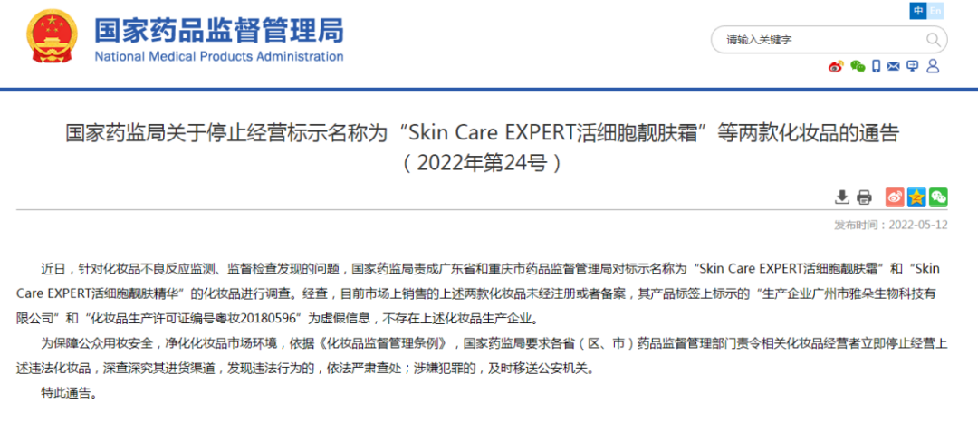上述说法也有案例佐证。今日,国家药监局发布通告停止经营标示名称为“Skin Care EXPERT活细胞靓肤霜”等两款化妆品。经查发现产品未注册或备案,标示生产企业广州雅朵为虚假信息。对这两款化妆品展开调查,正是基于在化妆品不良反应监测、监督检查发现的问题。