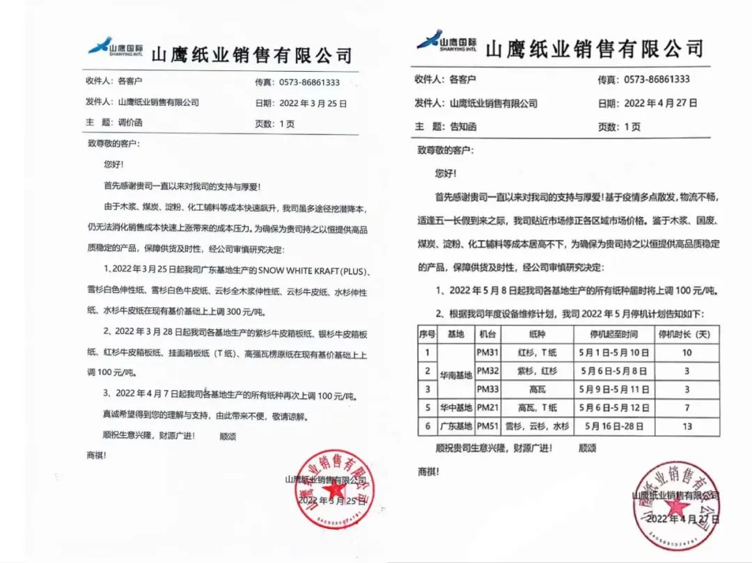 随着纸浆价格“高涨不退”,一众纸企也开始陆续发布涨价函。