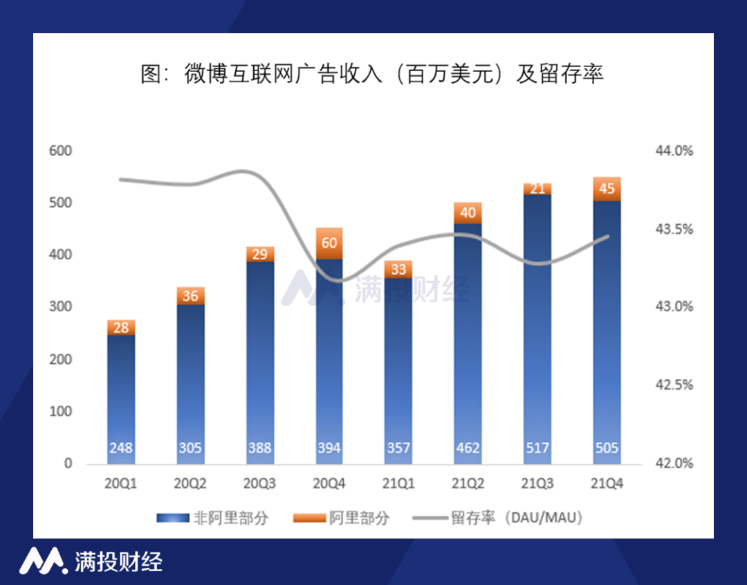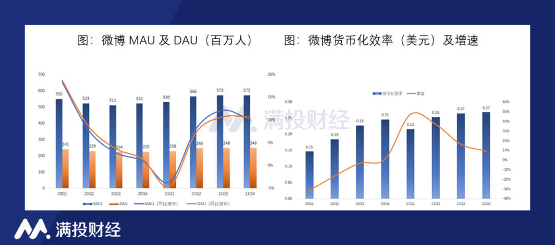 用户流量方面,2021Q4月度活跃用户(MAU)为5.73亿,同比增长10%,但略微低于预期1.2个百分点,平均日活跃用户(DAU)达2.49亿,同比增长10.7%;用每MAU平均收入衡量的流量货币化效率有显著提升,在2021Q4达0.27美元,业绩回暖的同时收入质量得到改善。