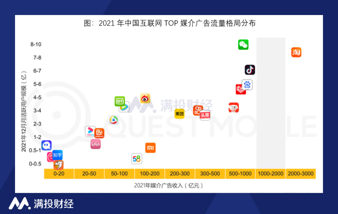 从产品矩阵着手进行分析,电商类产品二维数据表现优异,淘宝最具统治力:收获超2000亿媒介广告收入、手握与“社交基础设施”——微信相差无几的MAU,牢牢位居业内龙头。短视频内容社区紧随其后,行业“一哥”抖音广告收入也达近千亿;在线社交媒体则处于第三梯队,基于“UGC”+“PUGC”的内容社区面对未来的流量桎梏,遭受影响将会更大。