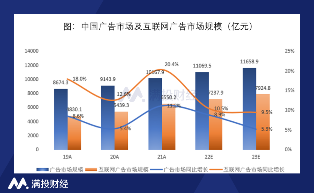 咨询机构预计互联网广告市场规模增速将放缓,据QM数据显示,21年互联网广告市场规模为5550.2亿元人民币,分季度同比增速下降幅度较大,渗透率已达54.6%,增长空间相对有限。