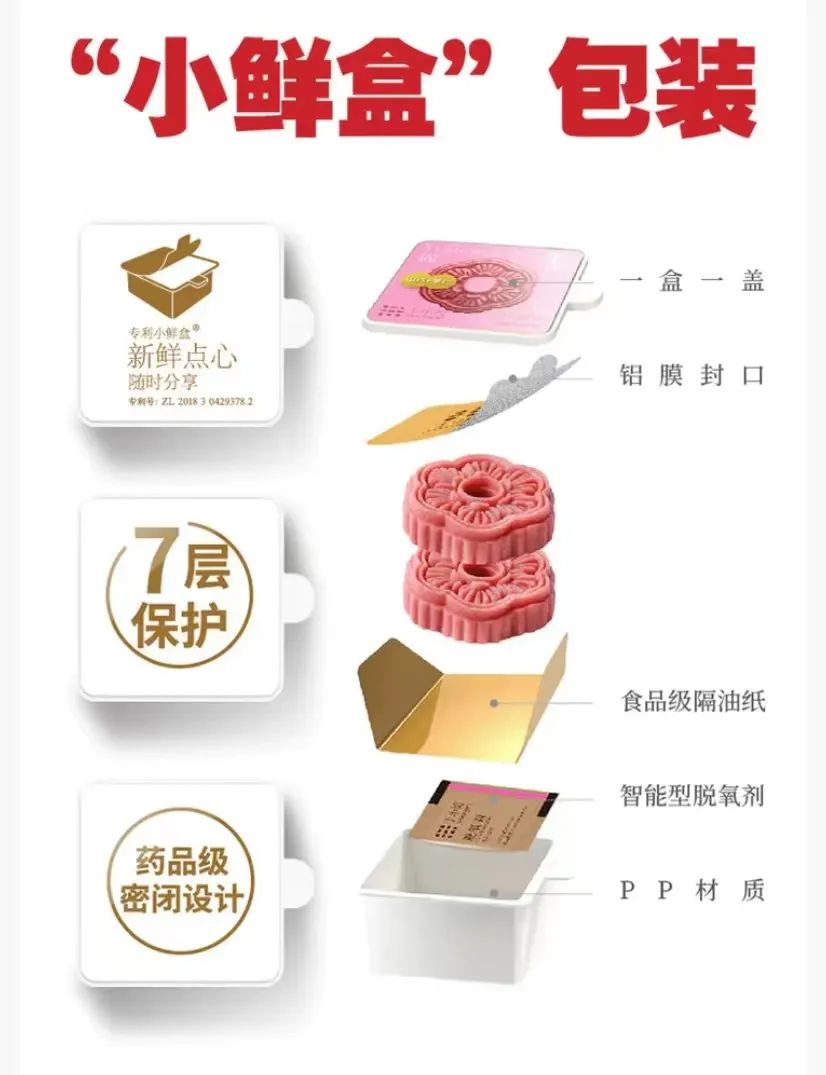 于小菓针对以往的点心都是保鲜性不强且容易漏气的问题,品牌采用食品级PP材质制作包装盒,且对产品进行脱氧密闭,在产品里面不添加防腐剂,只放入脱氧剂并配合铝膜封口。
