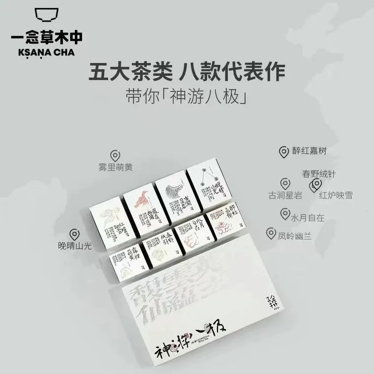 一念的「神游八极」的包装灵感则是来源于中国传统的「鲁班锁」和茶席上的「寸锦游戏」;「一念草木中ksanacha」的logo采用篆刻和印章的元素。外包装上是八个烫银大字,以及内包装的“不如饮茶”,简约中不失古朴。[3]