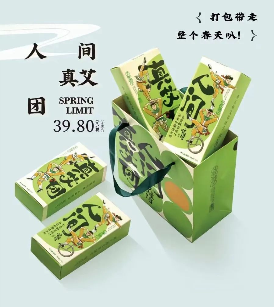 泸溪河作为新中式点心的代表,近日推出的“人间真艾团”青团系列包装就是采用了中国传统表演艺术之一的杂技文化;以及“人间真艾团”采用的是书法艺术。