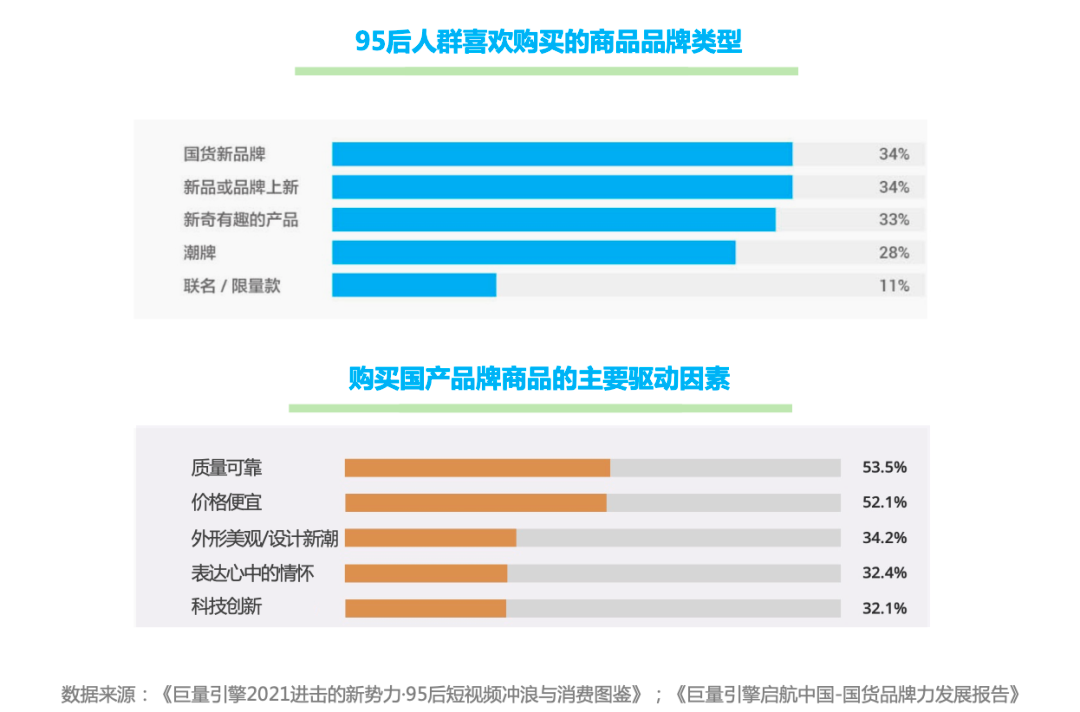 从《巨量引擎2021年进击的新势力 短视频冲浪与消费图鉴》中可以看到,95后人群最喜欢购买的是国货新品牌,“国潮热”可见端倪。年轻世代的消费者对于国货、带有中国文化的元素是买账的。