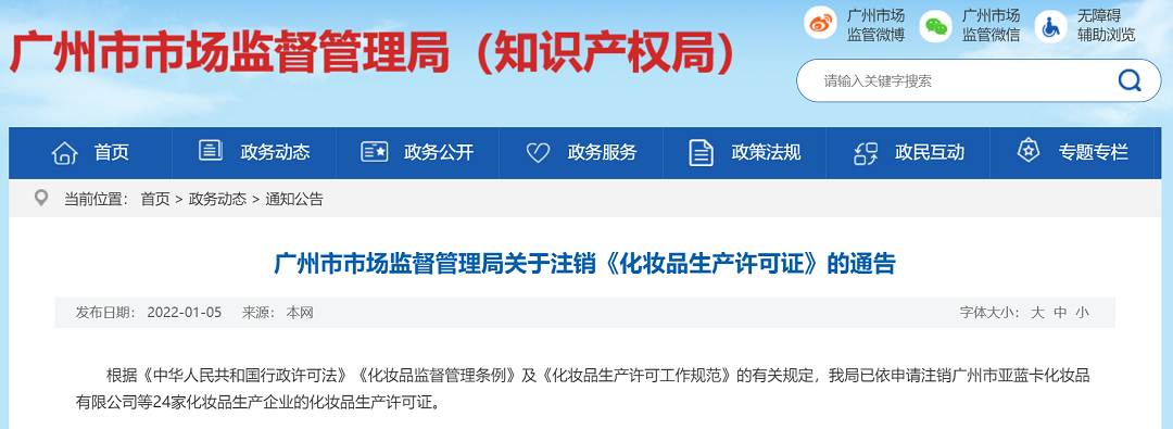 2022年1月5日,广州市市场监督管理局发布通告,已依法申请注销广州市亚蓝卡化妆品有限公司等24家化妆品生产企业的化妆品生产许可证。值得注意的是,这24家企业均属于“主动注销”。