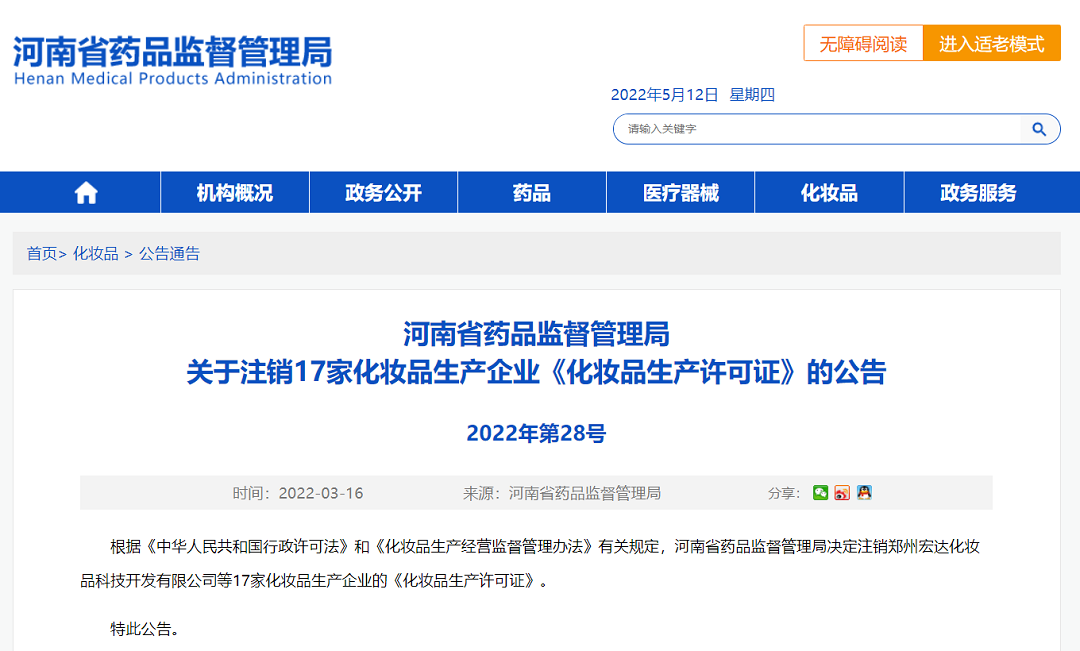 据聚美丽不完全统计,截至发稿前,今年全国至少有78家企业注销了化妆品生产许可证。自2022年开年以来,广东省、河南省、辽宁省、陕西省、四川省、湖北省、湖南省、河北省、江西省、甘肃省和新疆维吾尔自治区这11个省(自治区)陆续相继发布了注销企业《化妆品生产许可证》的通知。