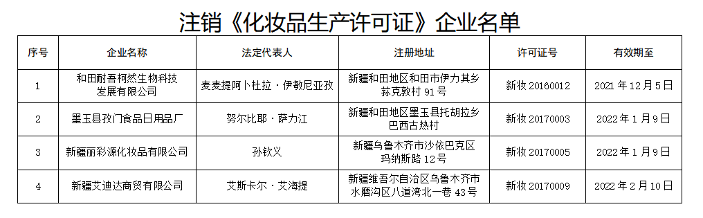 其中,新疆维吾尔自治区药监局注销了和田耐吾柯然生物科技发展有限公司、墨玉县孜门食品日用品厂、新疆丽彩源化妆品有限公司和新疆艾迪达商贸有限公司这4家企业持有的《化妆品生产许可证》,系有效期届满未申请延续。