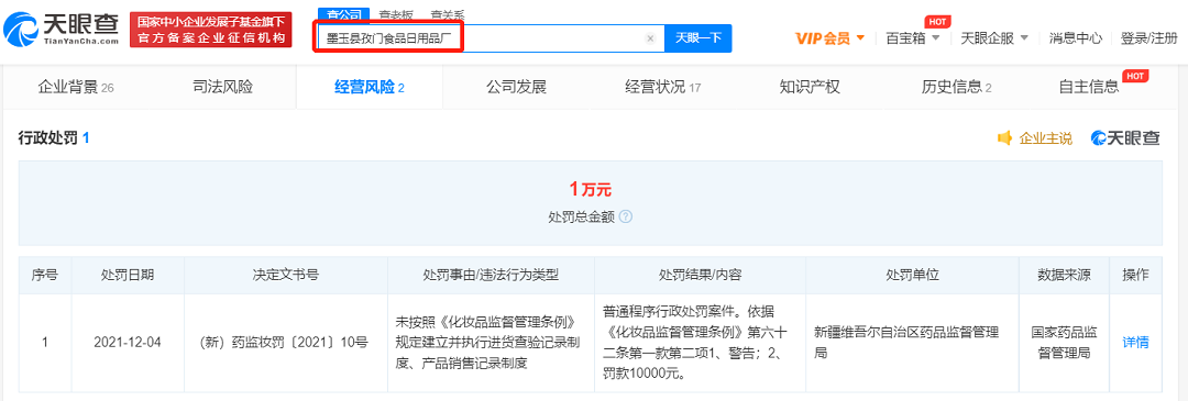 值得注意的是,聚美丽记者查询天眼查后发现,上述企业中有3家已经注销,仅墨玉县孜门食品日用品厂还处于存续状态。但去年12月,该公司因未按照《化妆品监督管理条例》规定建立并执行进货查验记录制度、产品销售记录制度 ,被新疆维吾尔自治区药监局罚款1万元。