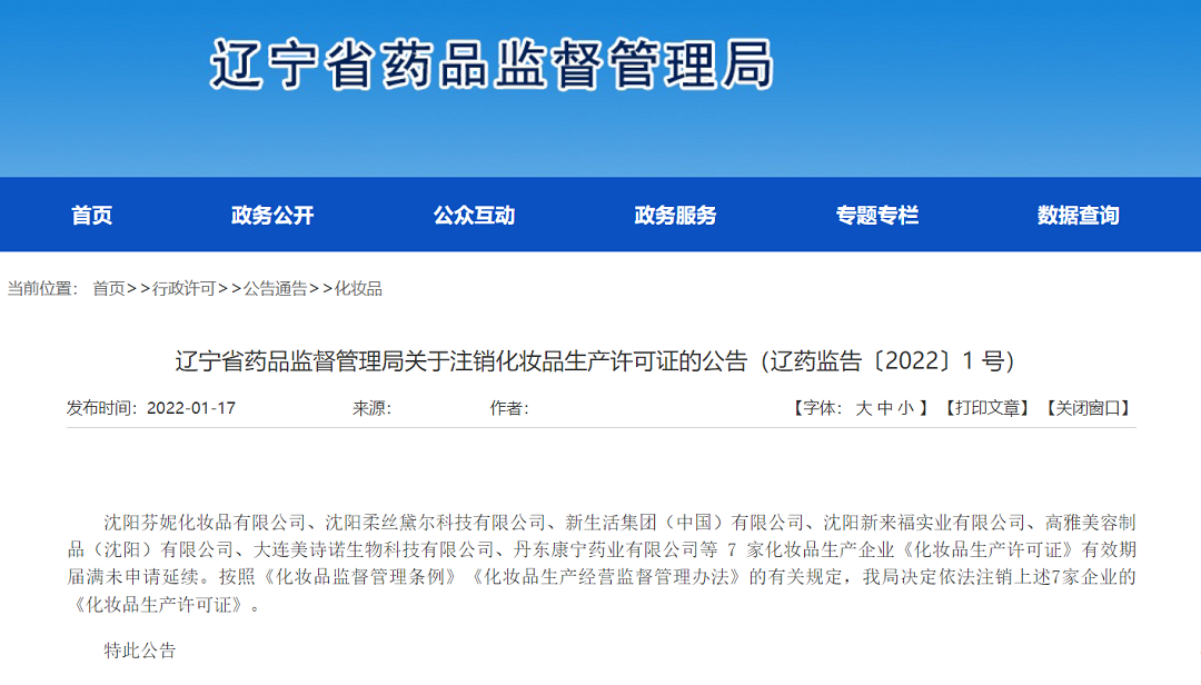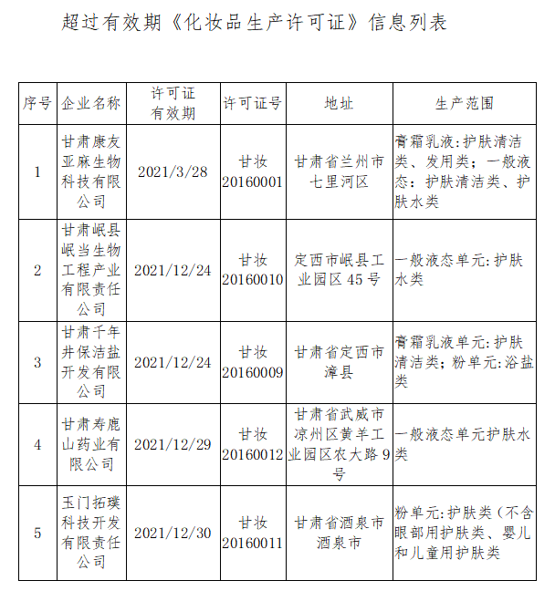 而甘肃省药监局则注销了甘肃康友亚麻生物科技有限公司、甘肃岷县岷当生物工程产业有限责任公司、甘肃千年井保洁盐开发有限公司、甘肃寿鹿山药业有限公司和玉门拓璞科技开发有限责任公司这5家企业持有的《化妆品生产许可证》,系超过有效期。