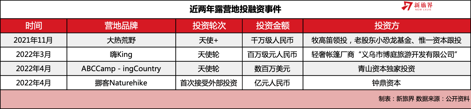 资本已表现出对露营地的青睐,就在去年底今年初陆续有四家新兴营地品牌获得投资。2021年11月,刚成立一年的“大热荒野”连续获得两轮千万元级别投资,其中有牧高笛以1000万元认购其10%股权;今年3月,“嗨King”野奢营地获得百万级的天使轮融资;青山资本也投资了户外生活方式品牌“ABCCamp-ingCountry”;此外,户外装备品牌挪客Naturehike宣布完成近亿元融资,由钟鼎资本独家投资,据传挪客正在筹划进入营地连锁服务市场;而三夫户外也早已进入营地经营,其在北京平谷的嗨谷营地是北京最火的营地之一;此外世茂、万科等地产公司也以合作等方式开始涉足露营地。