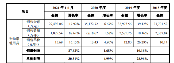 招股书显示,同期内,宠物牵引用具销售收入分别为2.37亿元、3.3亿元、3.52亿元以及2.95亿元,占主营业务收入的比例分别为54.81%、64.27%、58.01%、61.90%。报告期内,该系列产品的毛利率分别为33.15%、34.28%、34.89%、29.96%。