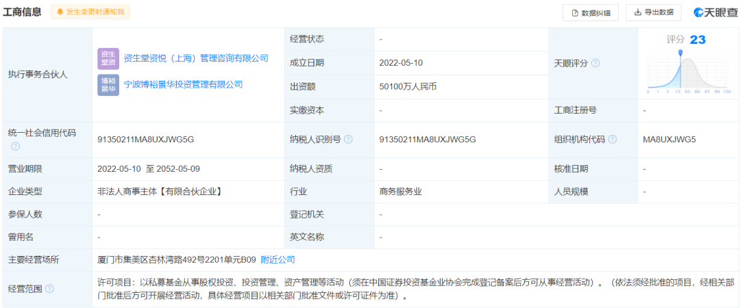 5月10日,厦门资悦股权投资合伙企业(有限合伙)注册成立,这是资生堂首个中国投资基金“资悦基金”的实体公司。公司注册资本5.01 亿元,经营范围包括以私募基金从事股权投资、投资管理、资产管理等活动。