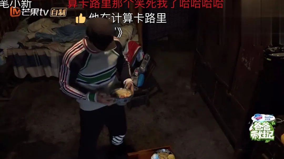 比如拿到早餐,他拿到手之后端详良久,弹幕中有网友“解说”:他在计算卡路里。