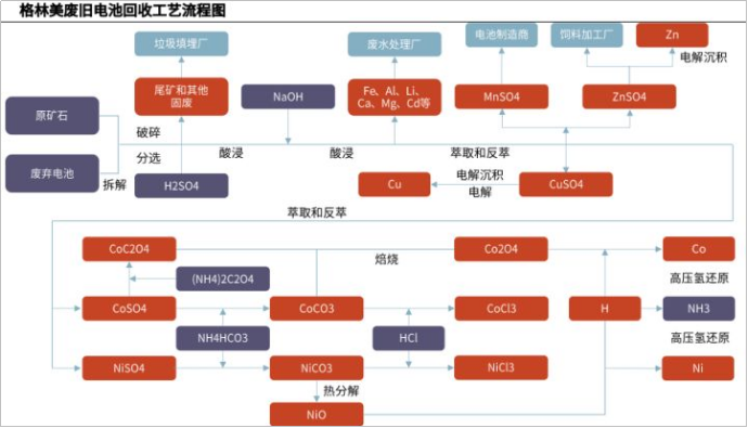 首先是绝对绕不开的格林美,作为国内电池回收的绝对龙头,其从2003年开始便启动了废旧电池回收业务,历时17年投资建设废旧电池与钴镍钨锗铟等稀有金属废物完整回收,到目前已经建成中国最大超细钴镍粉末制造基地,中国核心锂离子动力电池钴镍原料制造基地。