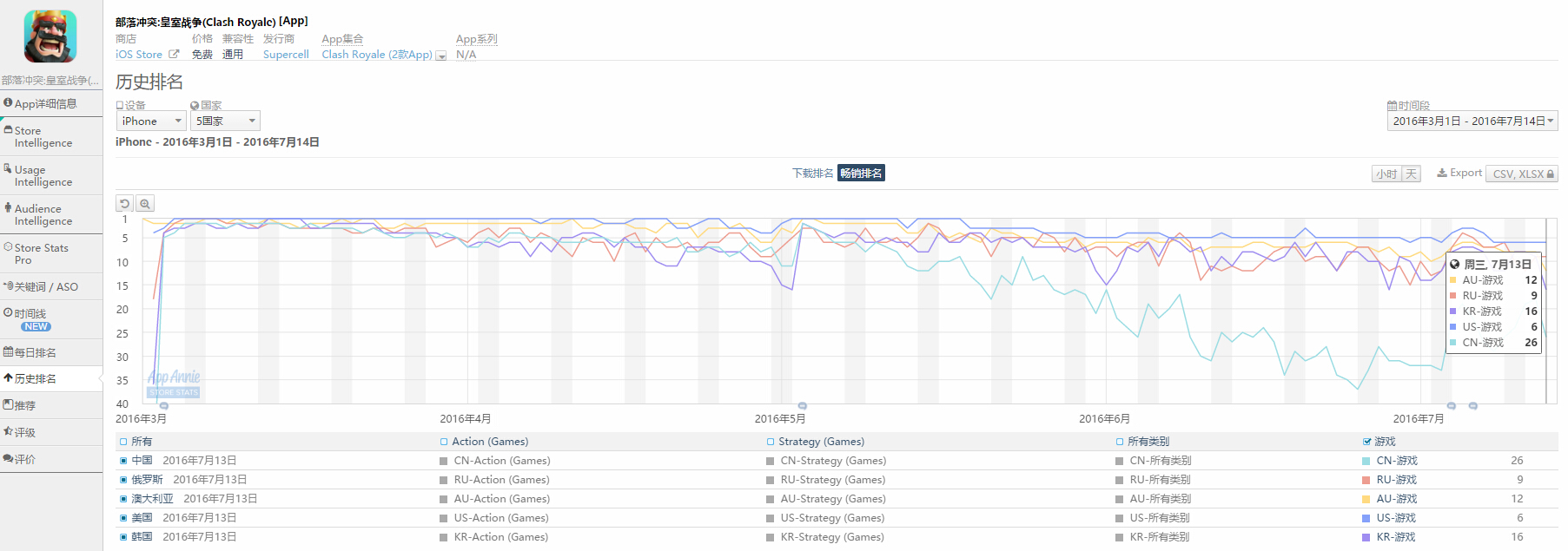3月2日《皇室战争》正式登陆中国区App Store并迅速冲上畅销榜第2的位置,引发诸多其将挑战网易《梦幻西游》收入冠军地位的猜测。不过仅仅三个月,排名就掉到了20名开外,而前作《部落冲突》从第2掉到第20名中间走过了漫长的一年零八个月。腾讯收购Supercell后迅速反应,想通过QQ和微信社交网络推荐和账号关联来拯救这款用户不断流失的产品。7月4日,《皇室战争》开启QQ和微信登陆功能并在游戏界面主推,App Store畅销榜排名在当天上升了10个名次,而后起起伏伏又回落到25名徘徊的水平。
