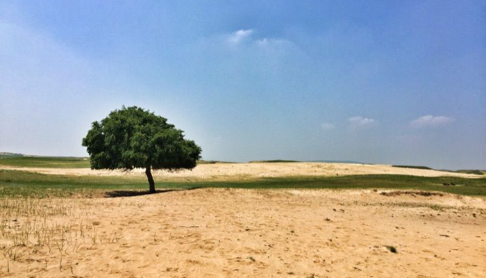 “挖坑要不大不小不深不浅,30cm×30cm×30cm,两个锄头的大小。放种子的时候要轻拿轻放,一埋二踩三提。”对我们来说,易妈妈的植树秘诀可以说是知易行难。由于长期干旱的气候环境,表层的泥土非常坚实,大家挖好一个完整的土坑就要花去半个小时,一不小心还会把树苗种歪了。尽管种树环境非常艰苦,但所有人都乐此不疲。因为只有站在这片沙土上,才能真正领悟到让绿化与沙化赛跑的必要性和迫切性。