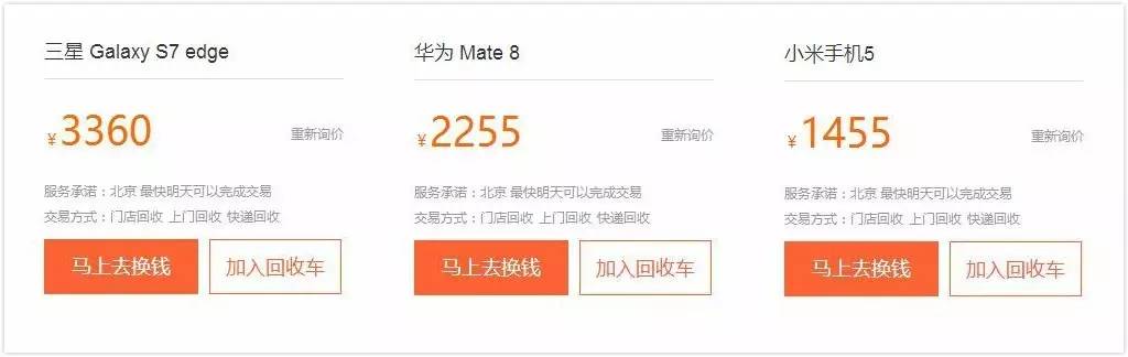 接下来我去某回收网站对比同样机型,结果如下:三星Galaxy S7 Edge,最高可折价3360元;华为Mate8 128GB版可折价2255元;而小米5高配版为1455元;对比下来我们发现,苹果合作方提供的这个价格明显要低于回收网站。这三者分别差了690元、315元和225元。同样是换手机,差距咋就那么大捏?