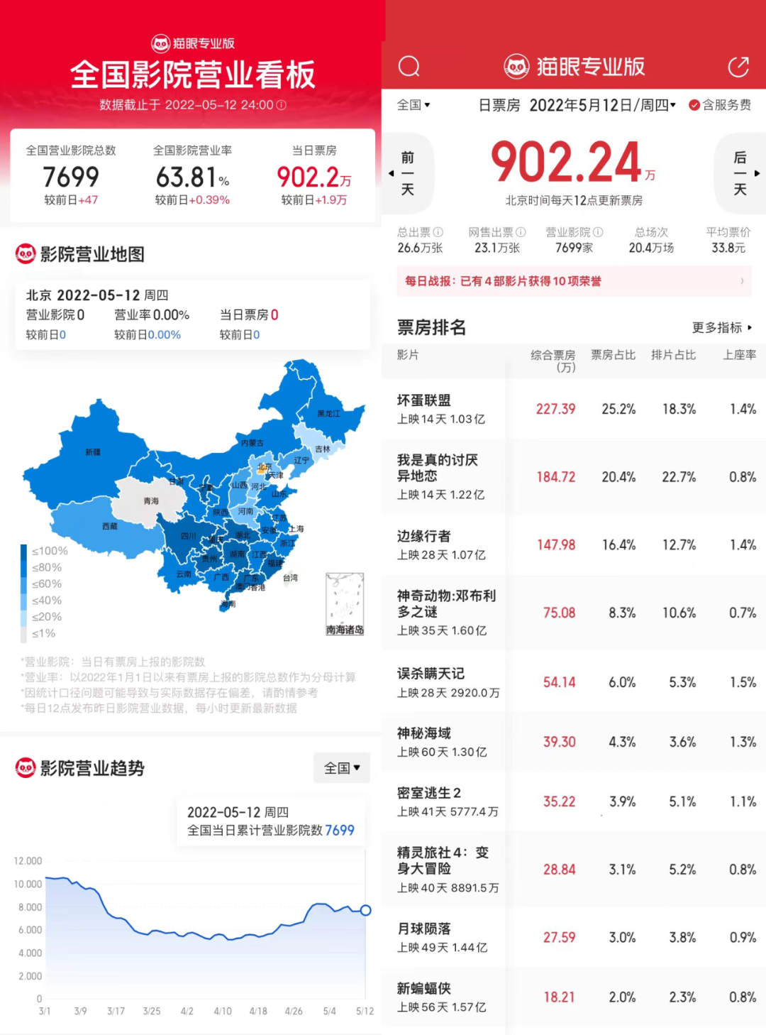 尽管恢复营业,影院仍然没有新片可放,仅剩几个月之前上映的旧片密钥一延再延。工作日大盘难破千万,营业率愈高愈凸显出全国影院的悲惨。这才有了前几天那出“影院跪求片方上片”。