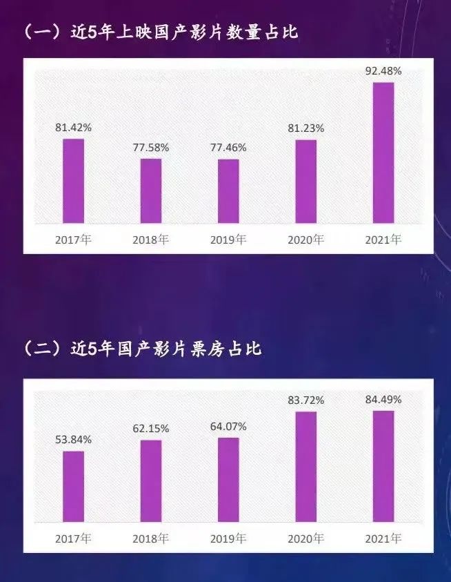 根据专资办《2021年度中国电影市场数据报告》,2021年中国内地全年上映新片572部,2020年为309部,2019年则为568部。其中国产影片数量占比和票房占比都在逐年上升,看起来一切向好。