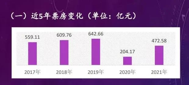 2019年年票房642.66亿元,其中国产影片票房411.75亿元;2020年年票房204.17亿元,其中国产影片票房170.93亿元;2021年年票房472.58亿元,其中国产影片票房399.28亿元。