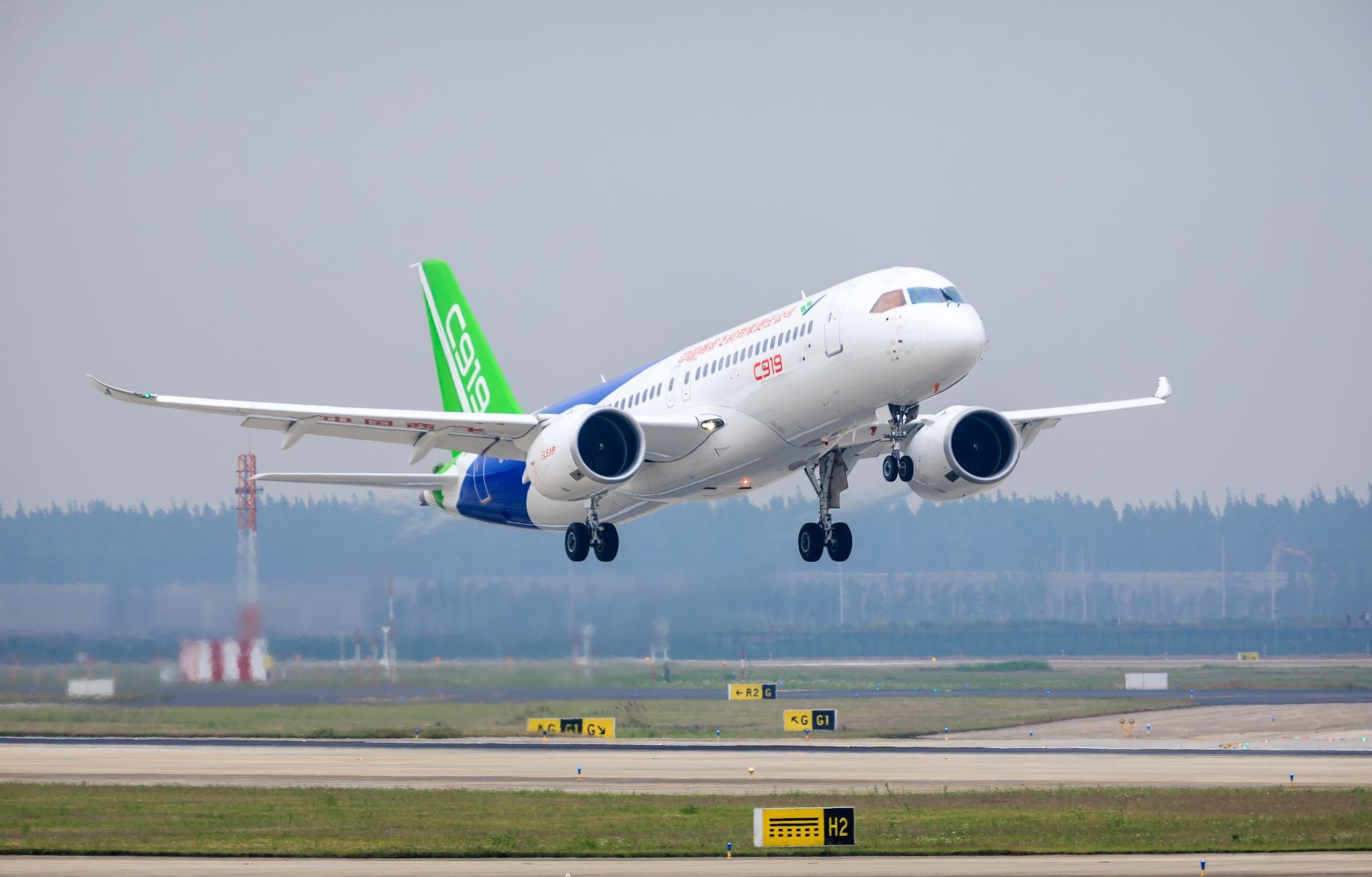 C919大型客机是我国按照国际民航规章自行研制、具有自主知识产权的大型喷气式民用飞机,座级158-168座,航程4075-5555公里;2015年11月2日完成总装下线,2017年5月5日在上海浦东国际机场成功首飞,累计28家客户815架订单。