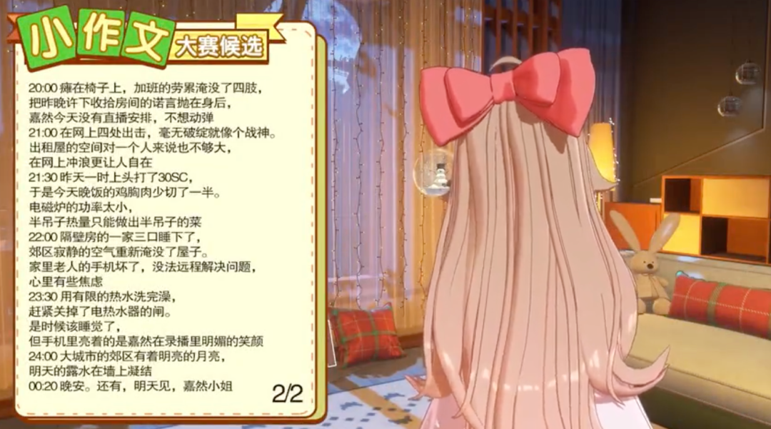 剧情发展到这里,黑粉放下偏见,路人粉开始念叨“想做嘉然小姐的狗”。嘉然此时趁热发出一篇真情实感小作文,道出打工人的辛酸,也说尽对支持者的感谢。这篇“社畜的告白”成了无数人梦开始的地方,至今仍是其吸粉的经典物料。