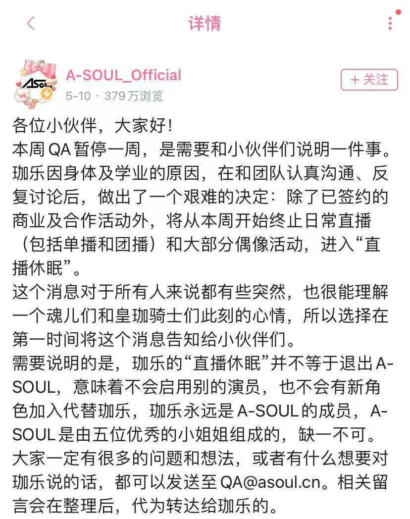 5月10日,A-SOUL在其主要活跃平台——B站官宣,珈乐因身体和学业原因,将终止日常直播和大部分偶像活动,进入“直播休眠”。并补充解释:这不等于珈乐彻底退团,不会启用其他演员,也不会增加新角色替代珈乐。