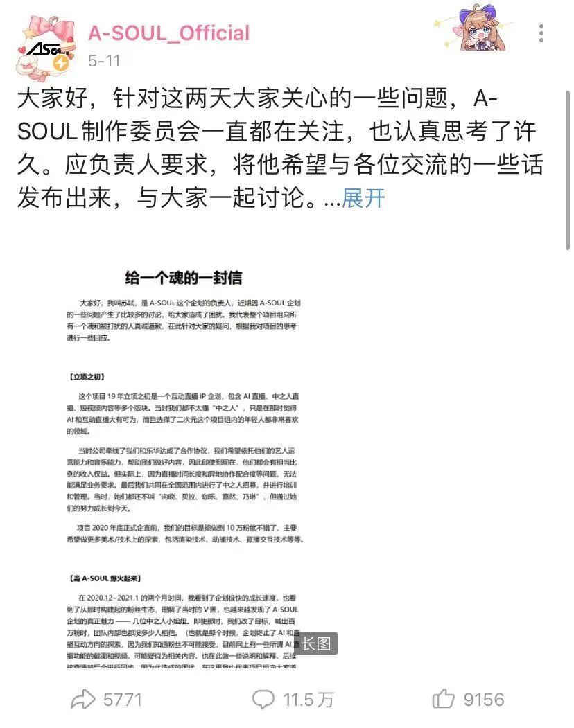 按粉丝说法,中之人虽然藏在皮下,但也是虚拟偶像的灵魂所在。A-SOUL不火的时候,她们领点打工薪水也就罢了。可如今A-SOUL已是日进斗金的顶流虚拟女团,五位小姐姐“不说过得光鲜亮丽,竟被克扣成这样”,能忍?